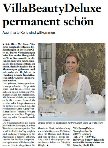 VILLABEAUTYDELUXE Shanghaiallee 3b  20457 Hamburg Tel.: 040 42907192  -  Mail: Info@Villa-Beauty-Deluxe.de (Hauptfiliale)